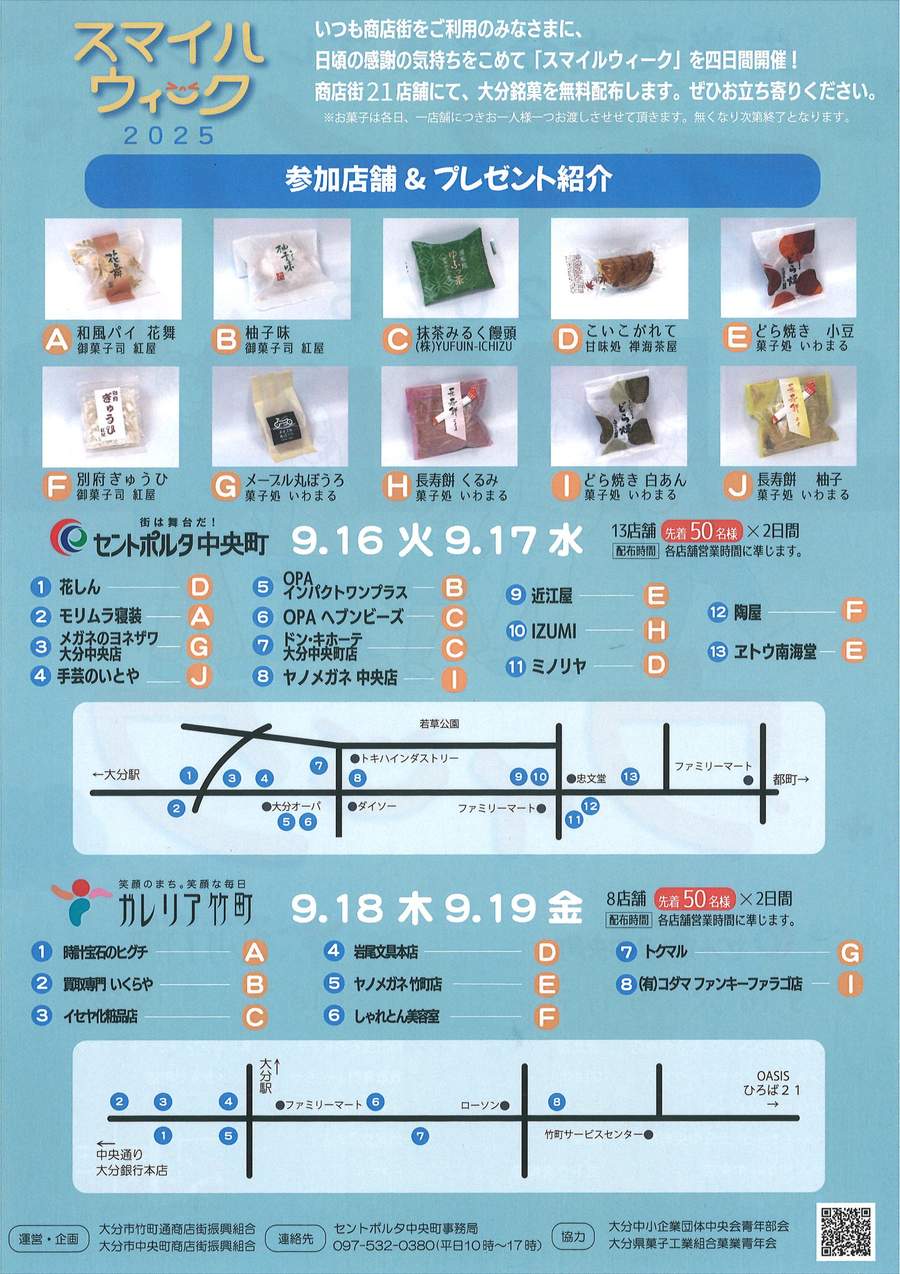 セントポルタ中央町商店街:メガネのヨネザワ、近江屋、OPAインパクトワンプラス、OPAヘブンビーズ、ドン・キホーテ大分中央町店、ヤノメガネ竹中央店、モリムラ寝装、手芸のいとや、IZUMI、ミノリヤ、陶屋、エトウ南海堂、花しん(以上13店舗、先着50名様×2日間)